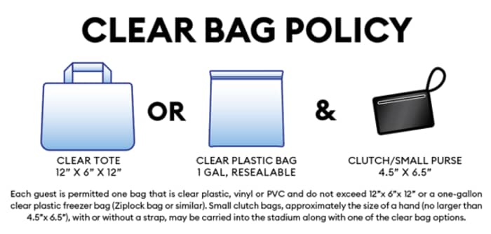 - Small clutch bags, approximately the size of a hand (no larger than 4.5” x 6.5”), with or without a handle or strap, may be carried into the stadium along with one of the clear bag options.